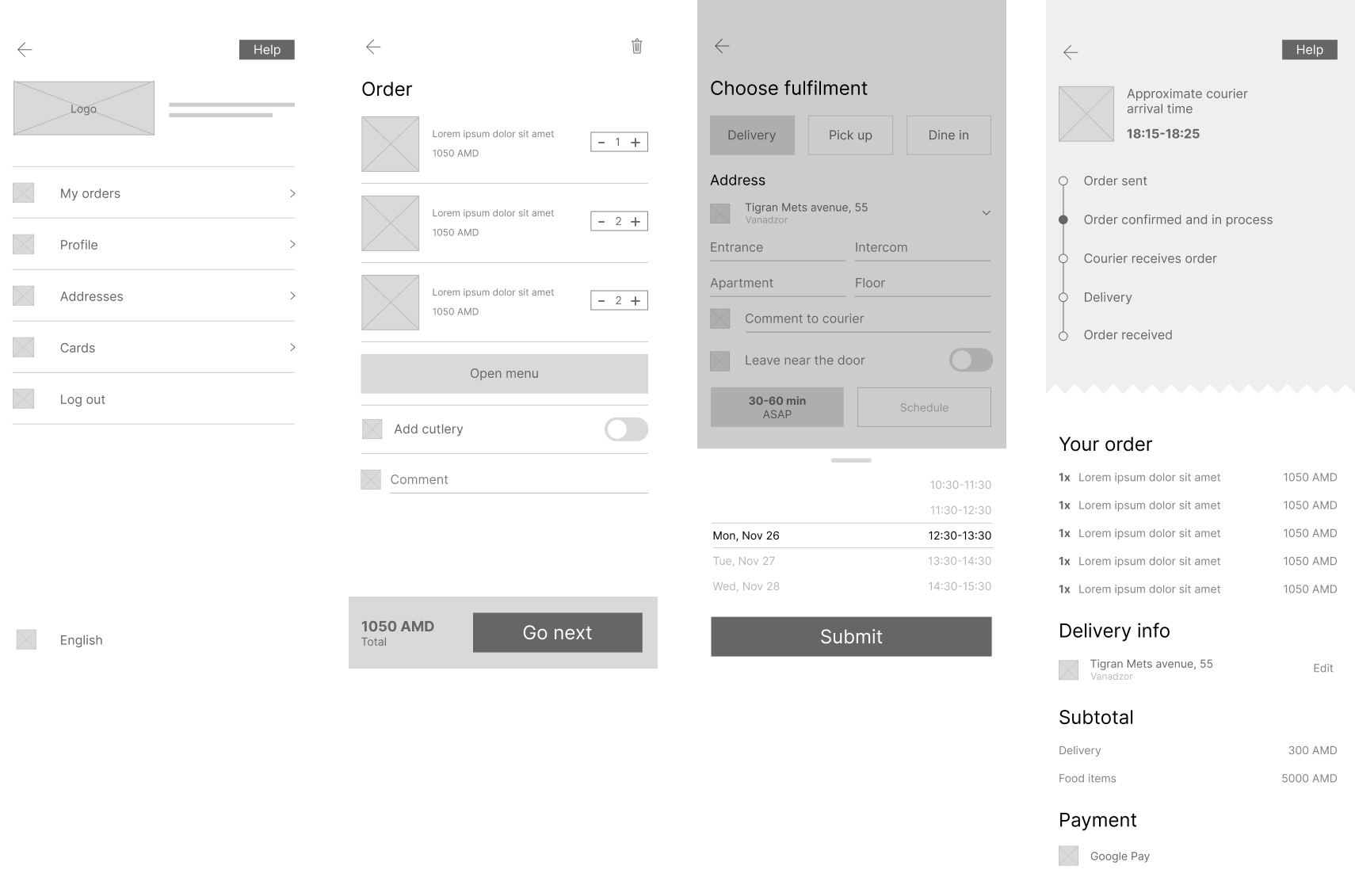 Mobile app for iOS that allows to place the order with delivery, pick up and dine in.